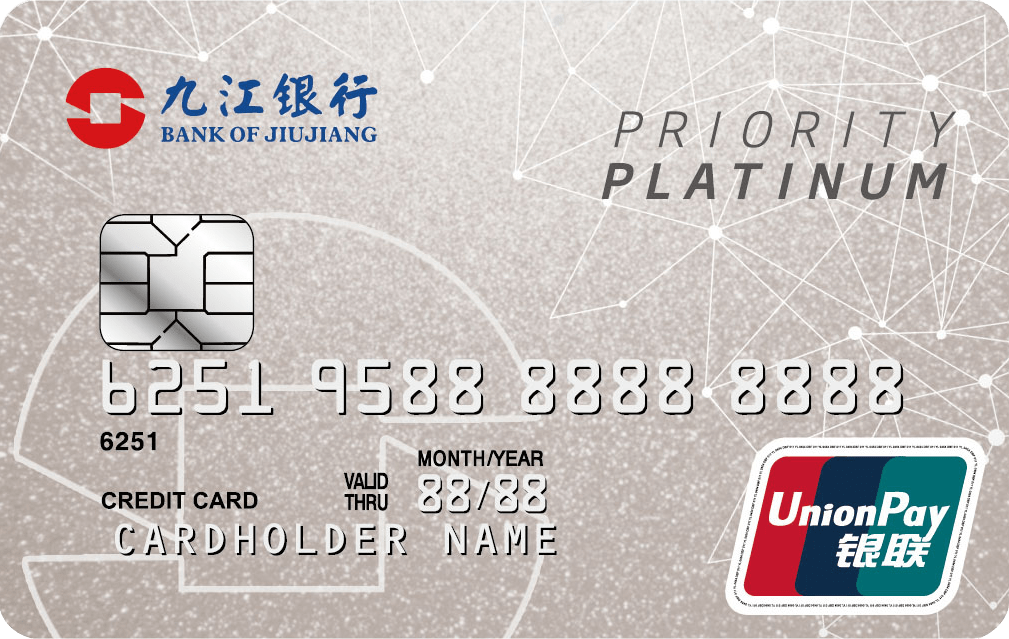 九江銀行白金卡是為我行高端用戶提供的優質卡種,尊享銀聯白金卡權益和我行各項優惠活動。