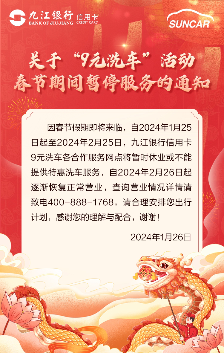 關(guān)于“9元洗車”活動春節(jié)期間暫停服務(wù)的通知