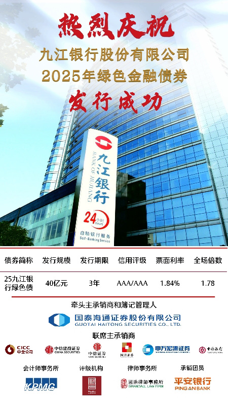 7月8日,九江銀行在全國銀行間債券市場成功發行2025年綠色金融債券(以下簡稱“本期債券”),發行規模40億元,票面利率1.84%。此次債券的成功發行,不僅是九江銀行在綠色金融領域的又一重大突破,更為長江經濟帶綠色低碳高質量發展注入了強勁動力。?