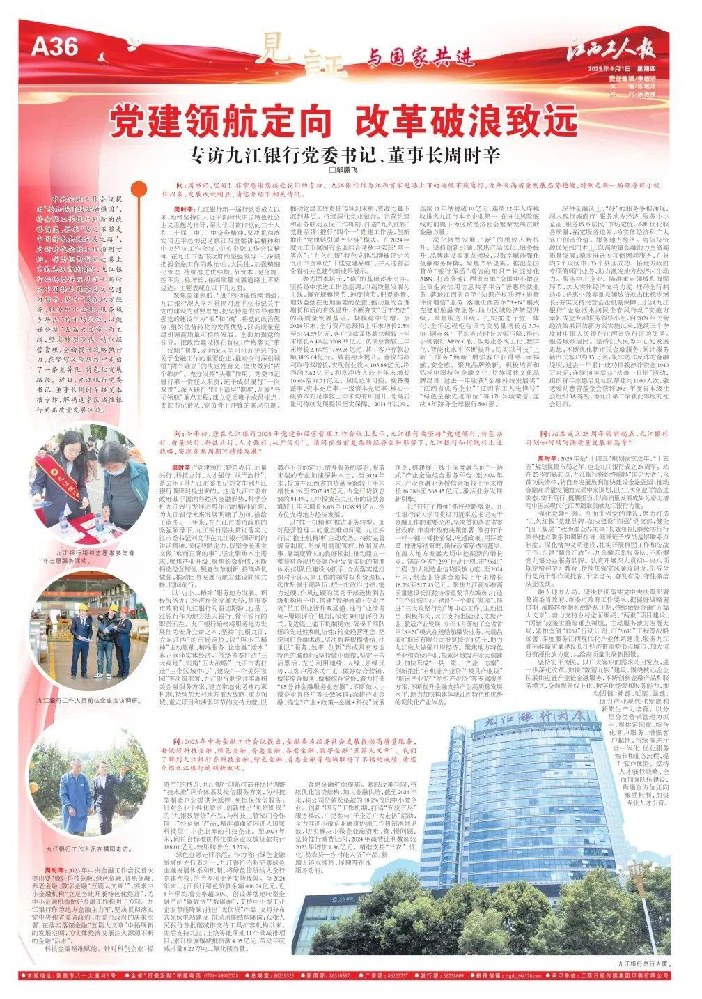周時辛:2025年是“十四五”規(guī)劃收官之年,“十五五”規(guī)劃謀篇布局之年,也是九江銀行成立25周年。站在25歲的新起點(diǎn),九江銀行將始終胸懷“國之大者”、永葆為民情懷,將自身發(fā)展放到加快建設(shè)金融強(qiáng)國、推動金融高質(zhì)量發(fā)展的大局中來謀劃,以“二次創(chuàng)業(yè)”的奮進(jìn)姿態(tài),實干篤行、挺膺擔(dān)當(dāng),以高質(zhì)量發(fā)展成果為奮力譜寫中國式現(xiàn)代化江西篇章貢獻(xiàn)九銀力量。