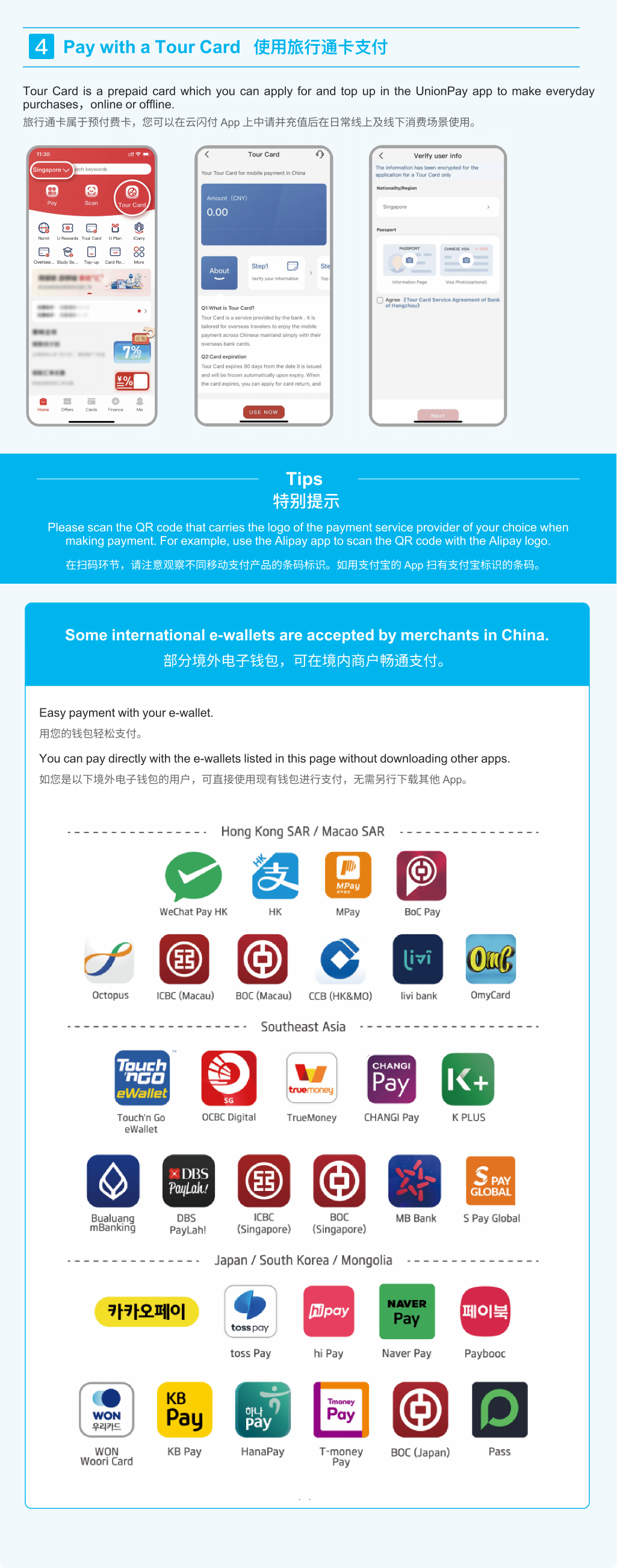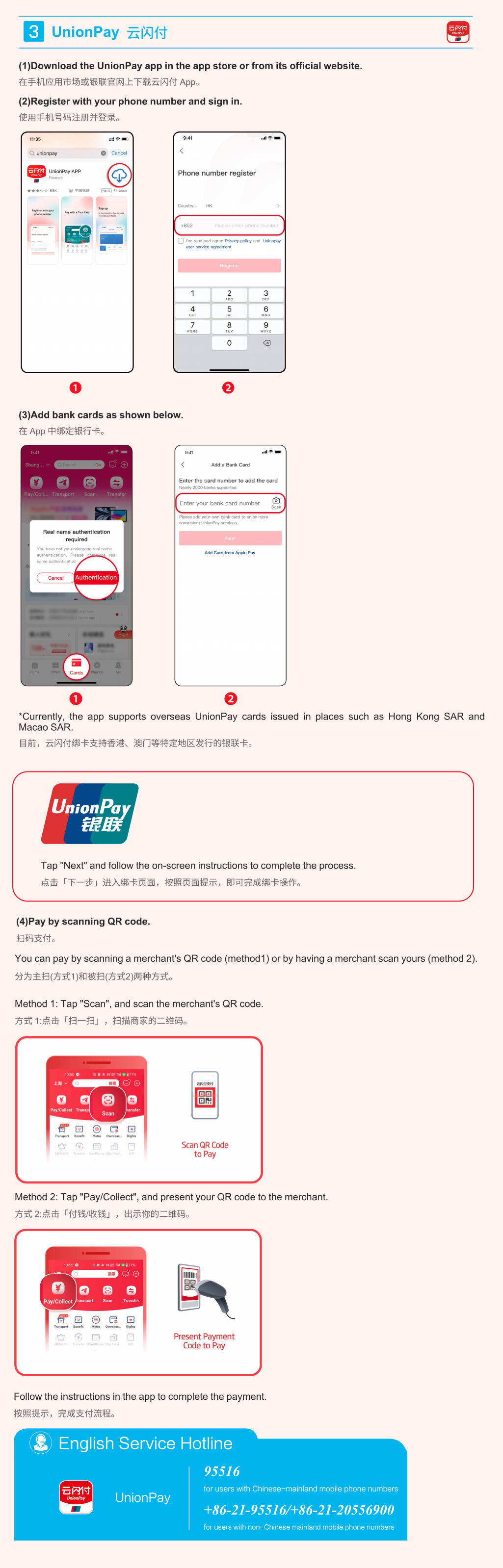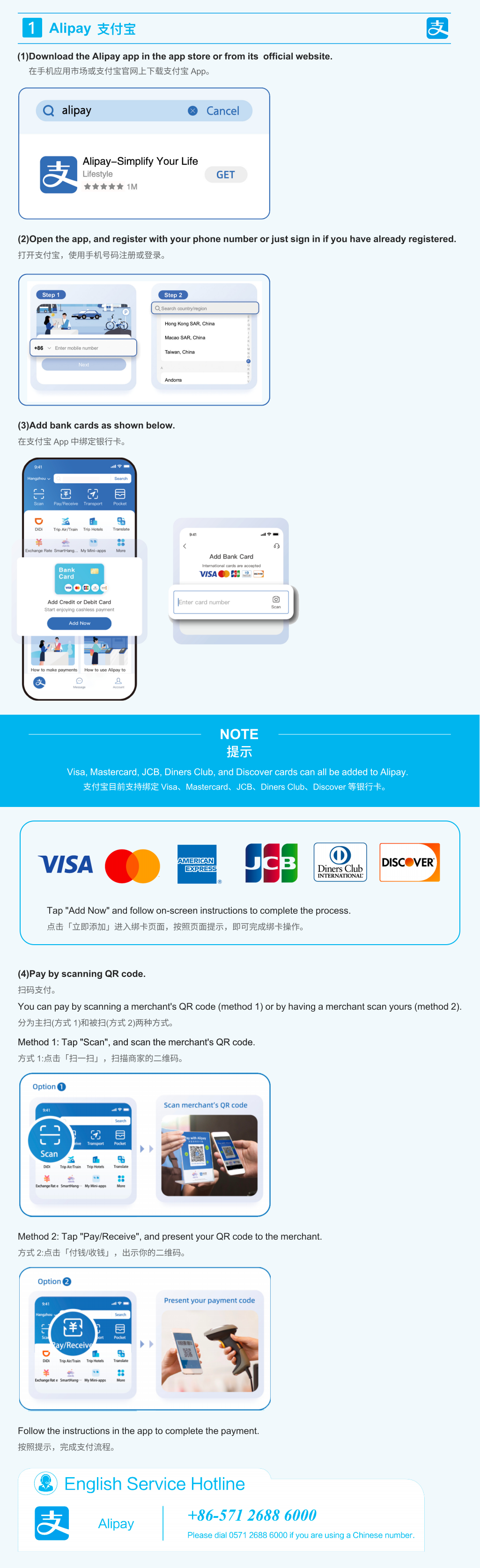 只需一部手機,就可以使用便捷的支付服務。我們提供支付寶、微信支付、云閃付等多種支付產品,您可自行選擇。為了便利您更好地使用移動支付產品,一定金額以下的交易免于采集身份信息。快來體驗吧!請訪問 www.pcac.org.cn 觀看操作視頻了解更詳細信息。