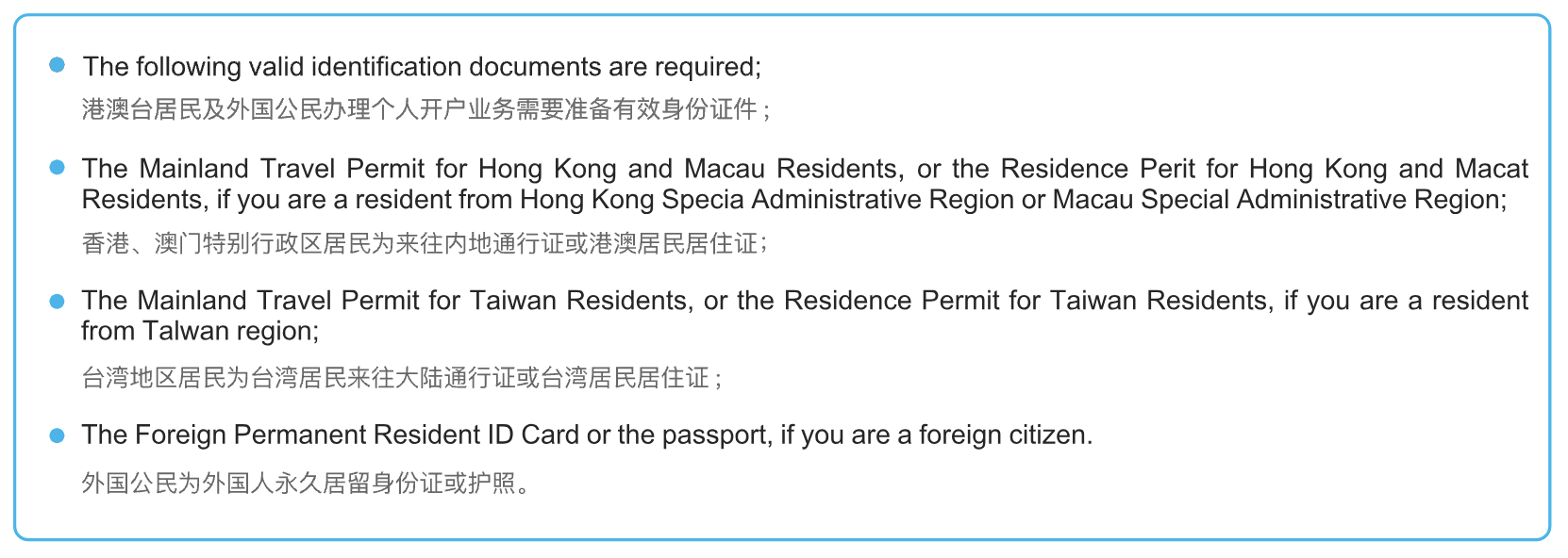 如您因工作或學習等理由長期居住在中國境內,需要開立賬戶,建議可同時提供工作證明、收入證明或學生證等資料,這將有效提升開戶審核效率。